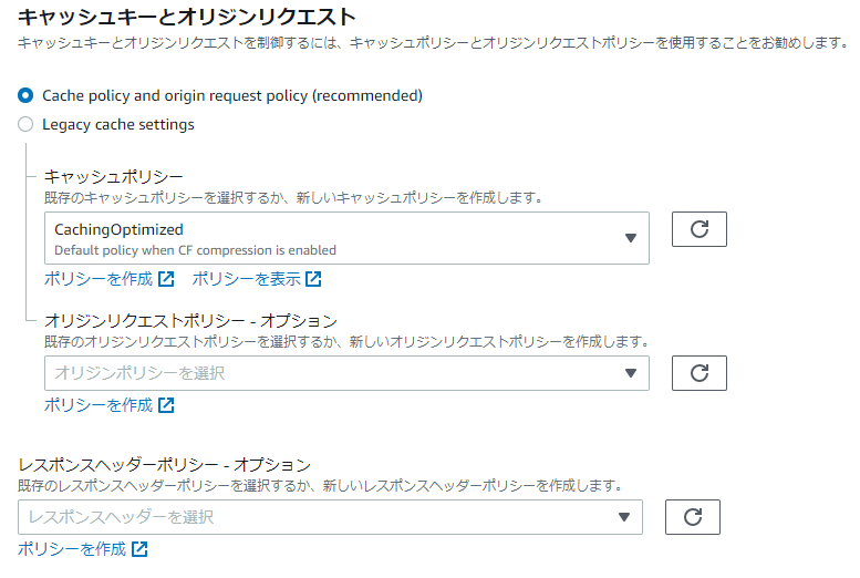また、キャッシュポリシーもデフォルトのCachingOptimizedで問題ありません。とはいえリダイレクトのレスポンスを返すだけですし、前述のように一度アクセスするとブラウザ側でキャッシュされるので、CachingDisabledを選択しても問題はないでしょう。